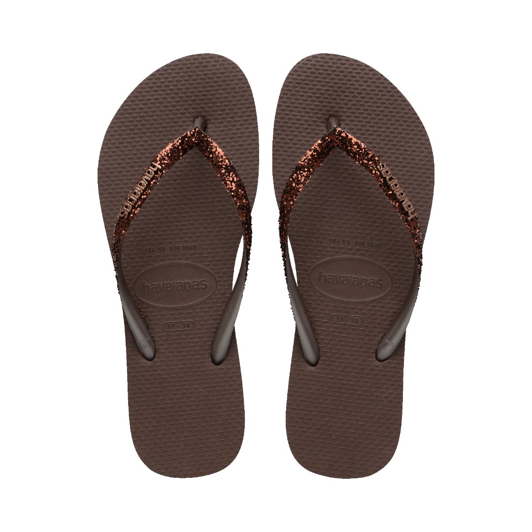 4146975 Chinelo Havaianas Slim Glitter II Fc Feminino 100% Original Chinelo A Havaianas Slim Glitter II é para quem gosta de brilhar muito! O novo formato do glitter aplicado nas tiras reflete a luz de uma forma mais pura, deixando o modelo ainda mais brilhante. Al&eac... R$79,99